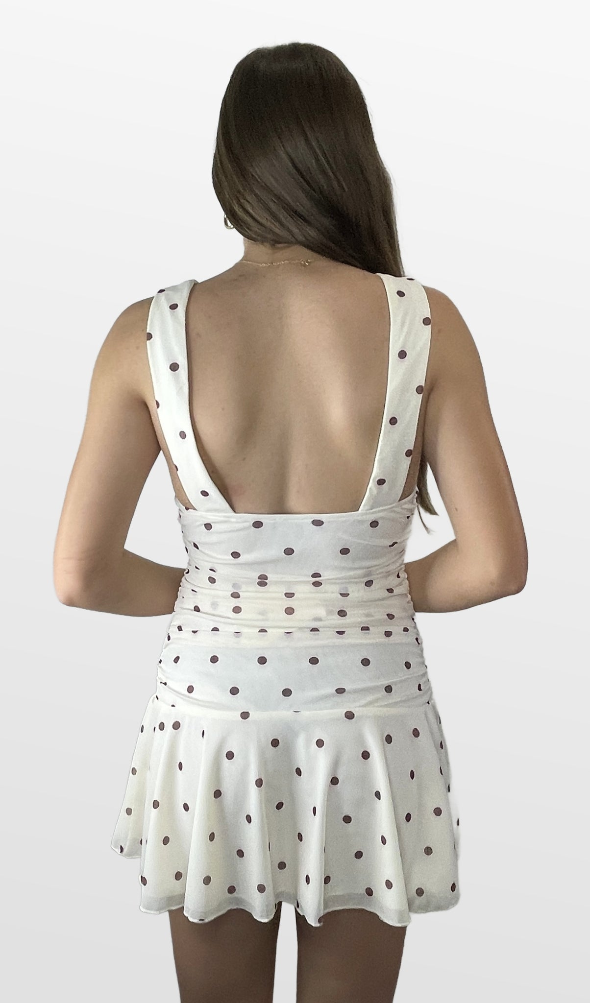 A playful take on a classic. This polka dot mini features a deep V-neckline, a flattering ruched bodice, and a flared hem for easy movement and feminine charm. Perfect for day dates or nights out. Color- Cream with Brown Dots (Also Available in Light Blue with Brown Dots) 92%Polyester 8%Spandex Lining- 100%Polyester
