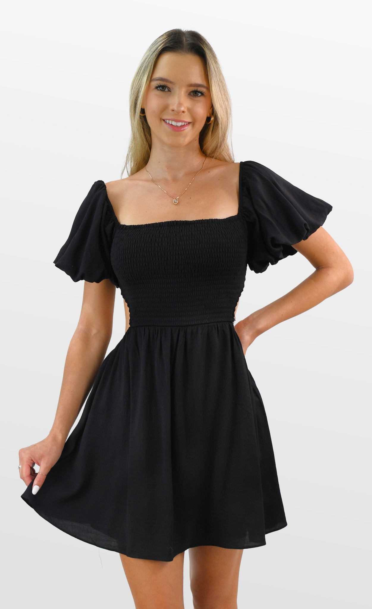 Sweet with a little edge. Fully smocked bodice for a flattering fit, this open midriff dress features puff cap sleeves, an elastic waist, and a lined skirt for a subtle flirt. Looks great with boots and perfect for a blackout gameday!