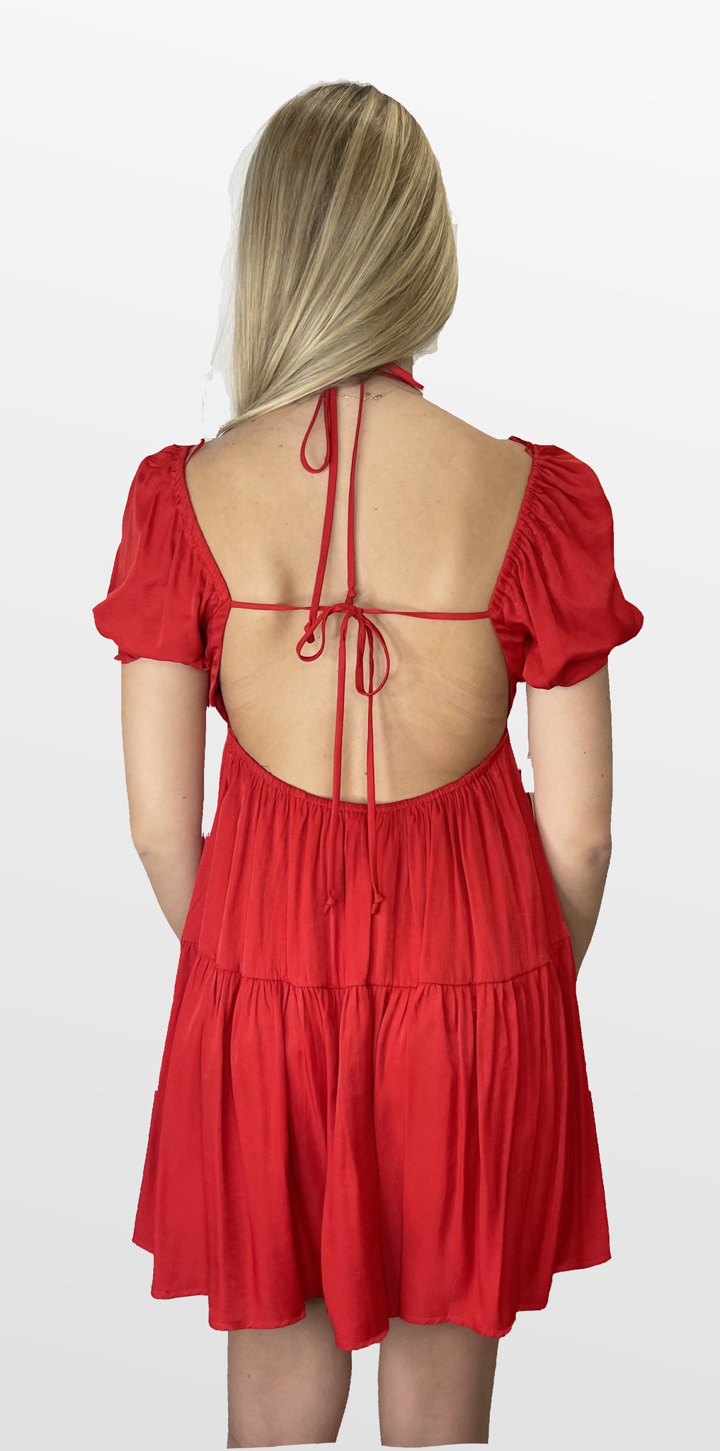 This dress will have you saying -YES! The fit and details are fantastic! The dress has a deep-V neckline with just a touch of gathering and a string tie around the neck for a different look. The cap sleeves have elastic at the top and bottom for a perfect fit. The tiered skirt has a deep scoop back with elastic to create the best fit, and the top has ties to keep the Bodice in place. The soft fabric is fully lined for added structure and coverage. It is difficult not to like this dress! Color- Red (Also Available in White) 75% Rayon 25% Polyester Lining- 95% Polyester 5% Spandex