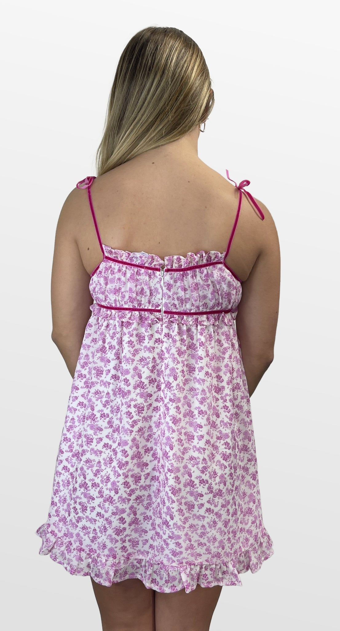 Bright florals + babydoll silhouette = instant yes. The babydoll dress features a square neckline with adjustable velvet straps, a contrast bodice detail, and a flirty front tie. The full skirt with ruffle trim and a back zipper creates the perfect fit, that's light, flirty, and effortlessly sweet. Color- Bright Pink 100% Polyester Lining-100% Polyester