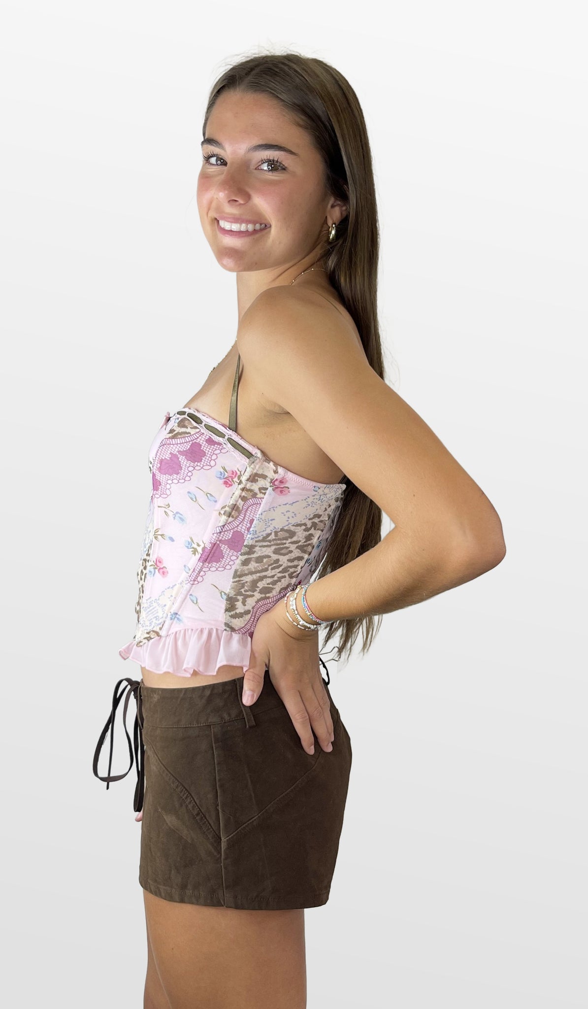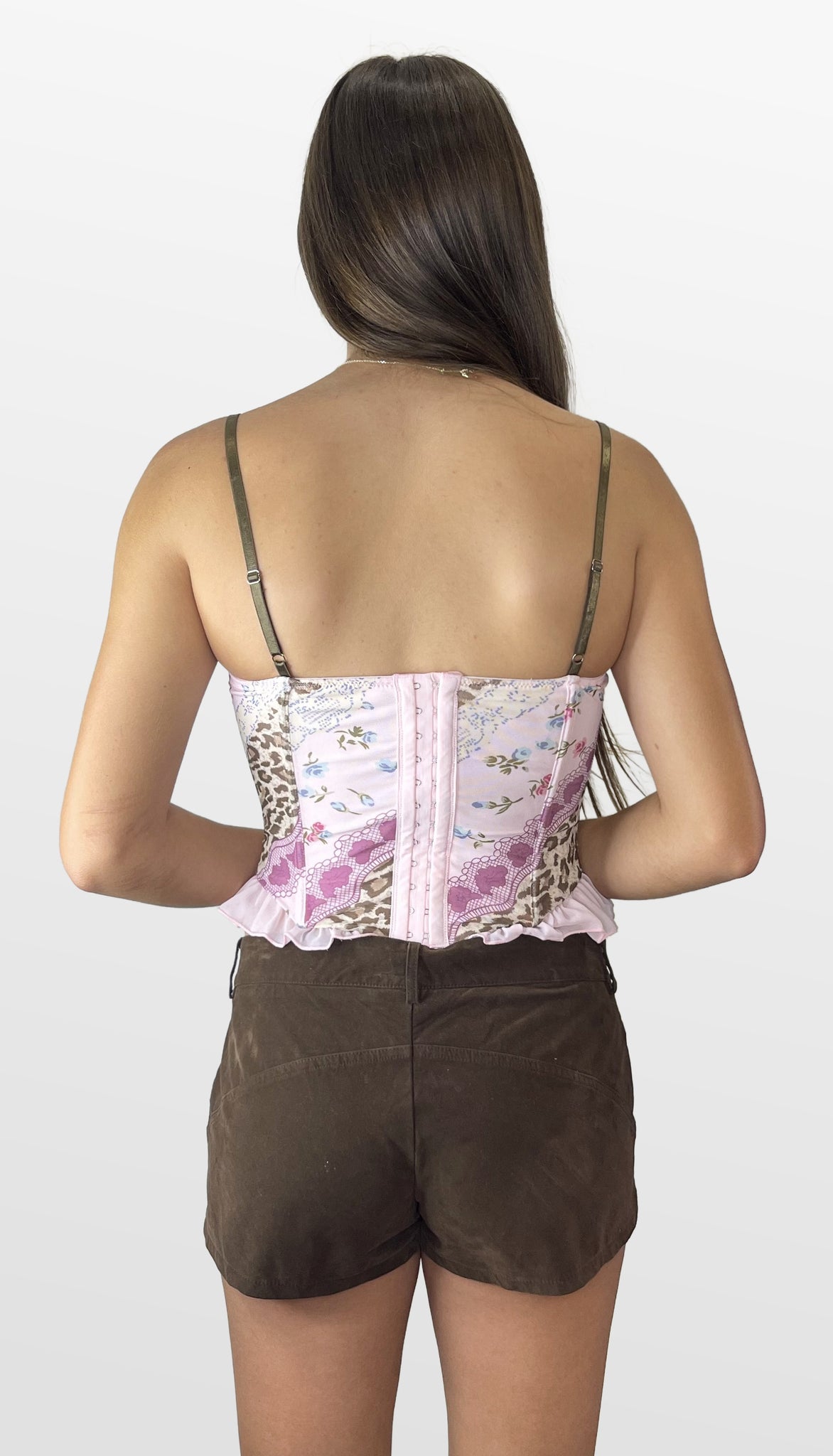 Turn heads in this ultra-feminine and playful corset-style top featuring a bold mix of patterns — from soft floral and romantic lace to edgy leopard print. Designed with a structured, bustier-style bodice, the top includes front lace-up detail, a mini satin bow at the neckline, and a ruffled hem for a flirty finish. The back hook and eye closure, along with adjustable straps, ensure a perfect fit. Color- Pink with Brown 95% Polyester 5% Spandex
