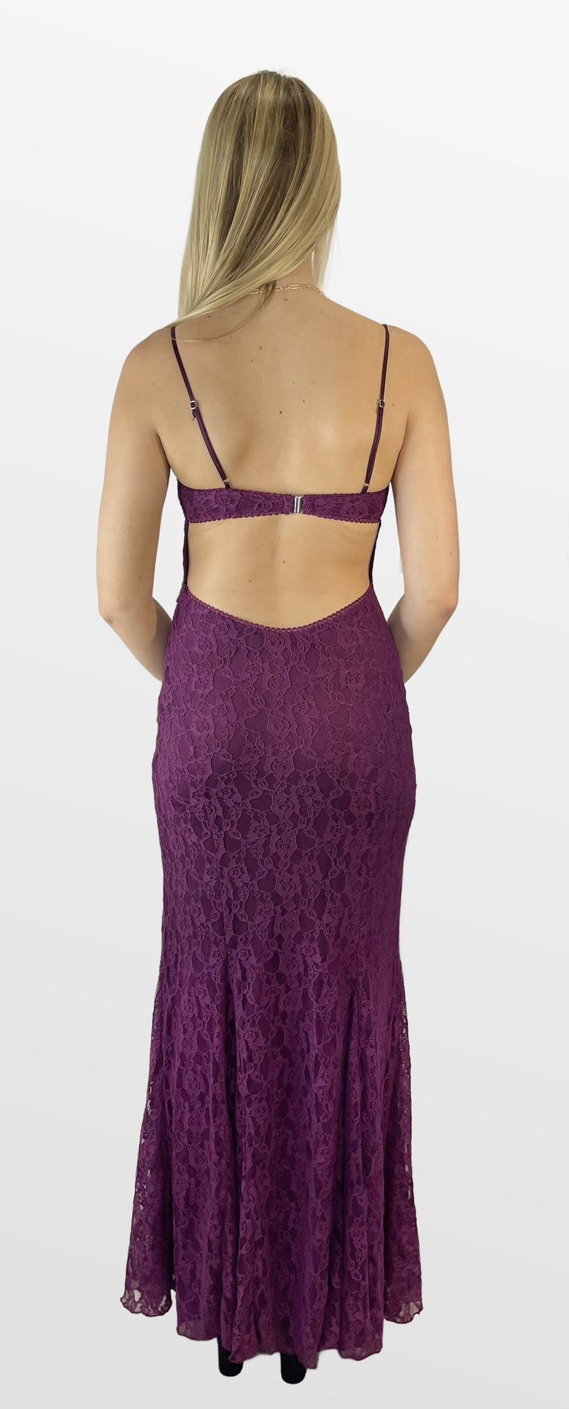 Shine in the season’s richest jewel tone with this stunning lace maxi dress. Designed with a fitted bodice, metal back clasp, and an open drop-back silhouette, it delivers an effortlessly sexy look. The fully lined lace fabric is both romantic and comfortable, while the flirty, flowy hem adds a touch of retro elegance. Perfect for special nights out, holiday parties, or when you want to turn heads! Color- Plum Wine 90% Nylon 10% Spandex Lining- 100% Polyester