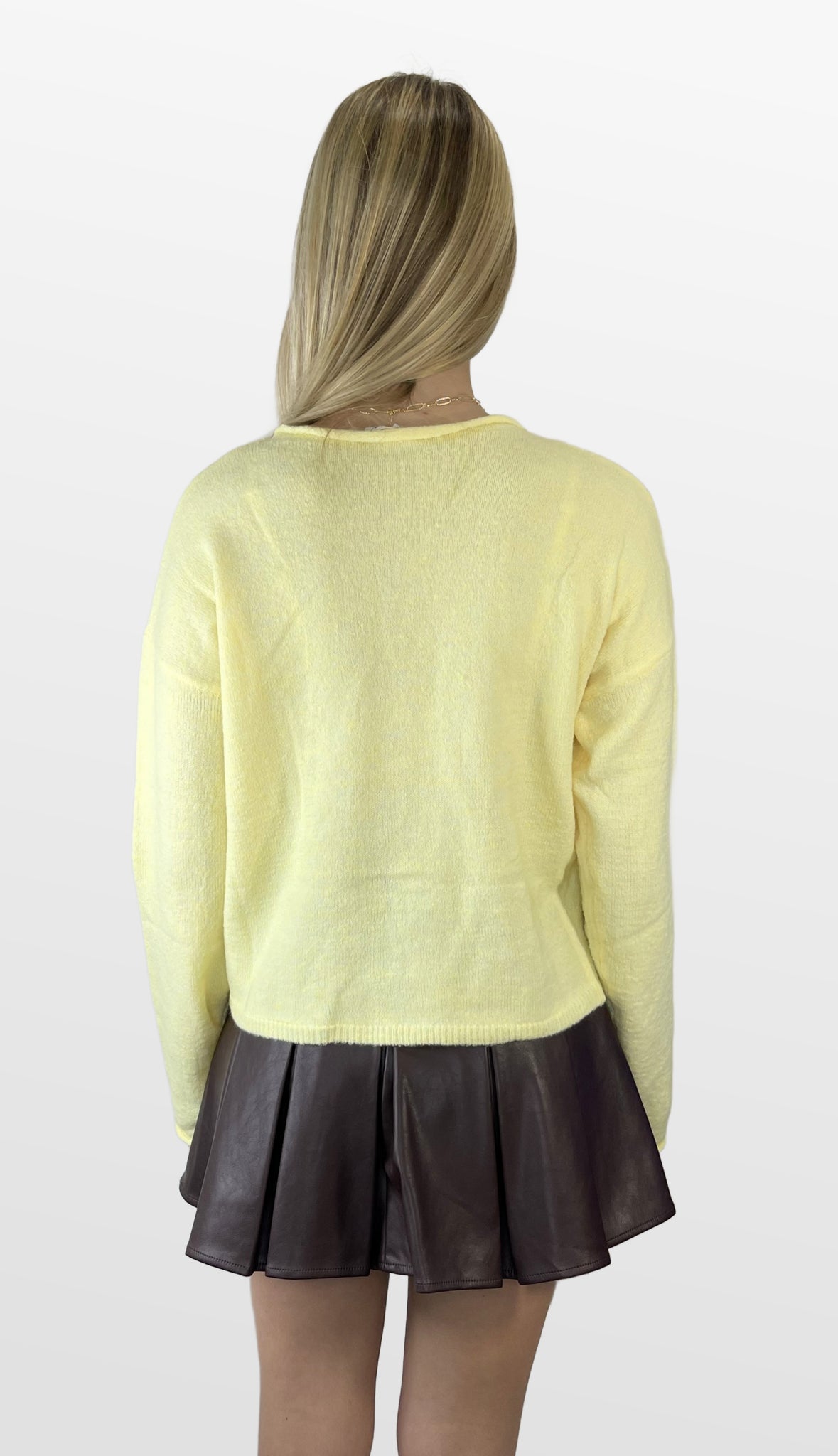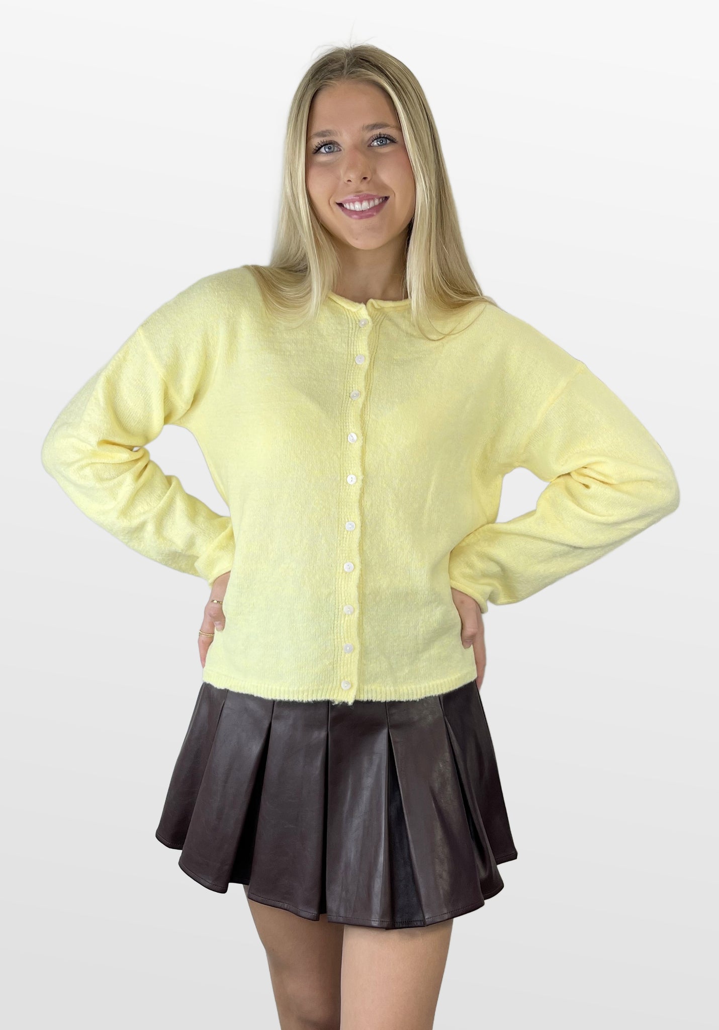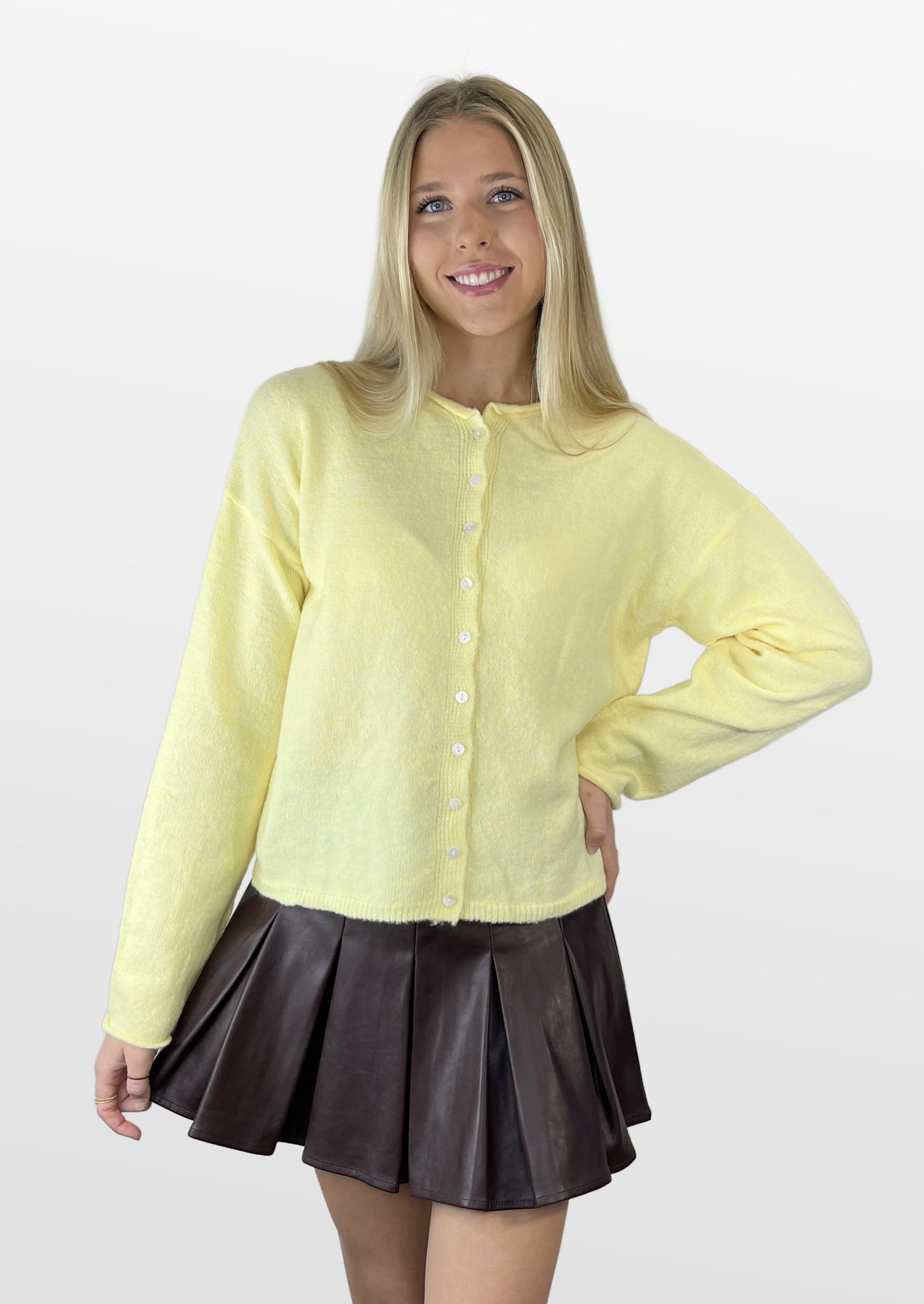 The softest, coziest layer your wardrobe needs. This staple cardigan features a rolled collar, button-down front, long sleeves with dropped shoulders, and a lightweight, relaxed fit. Wear it buttoned as a top or open over a tank—its classic-meets-contemporary style gives you endless outfit options year-round.  Pale Yellow  61% Polyester 15% Acrylic 15% Nylon 6% Wool 3% Spandex