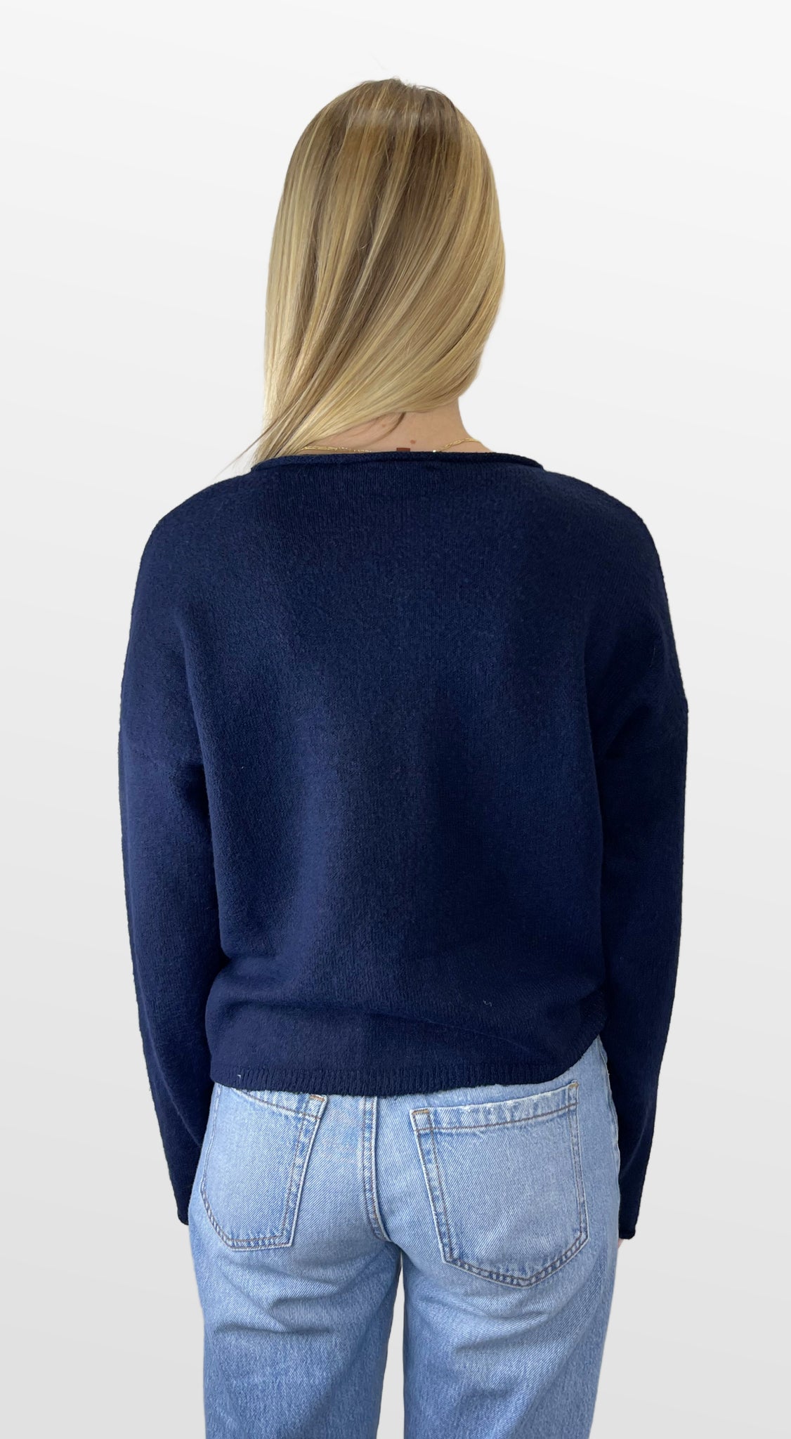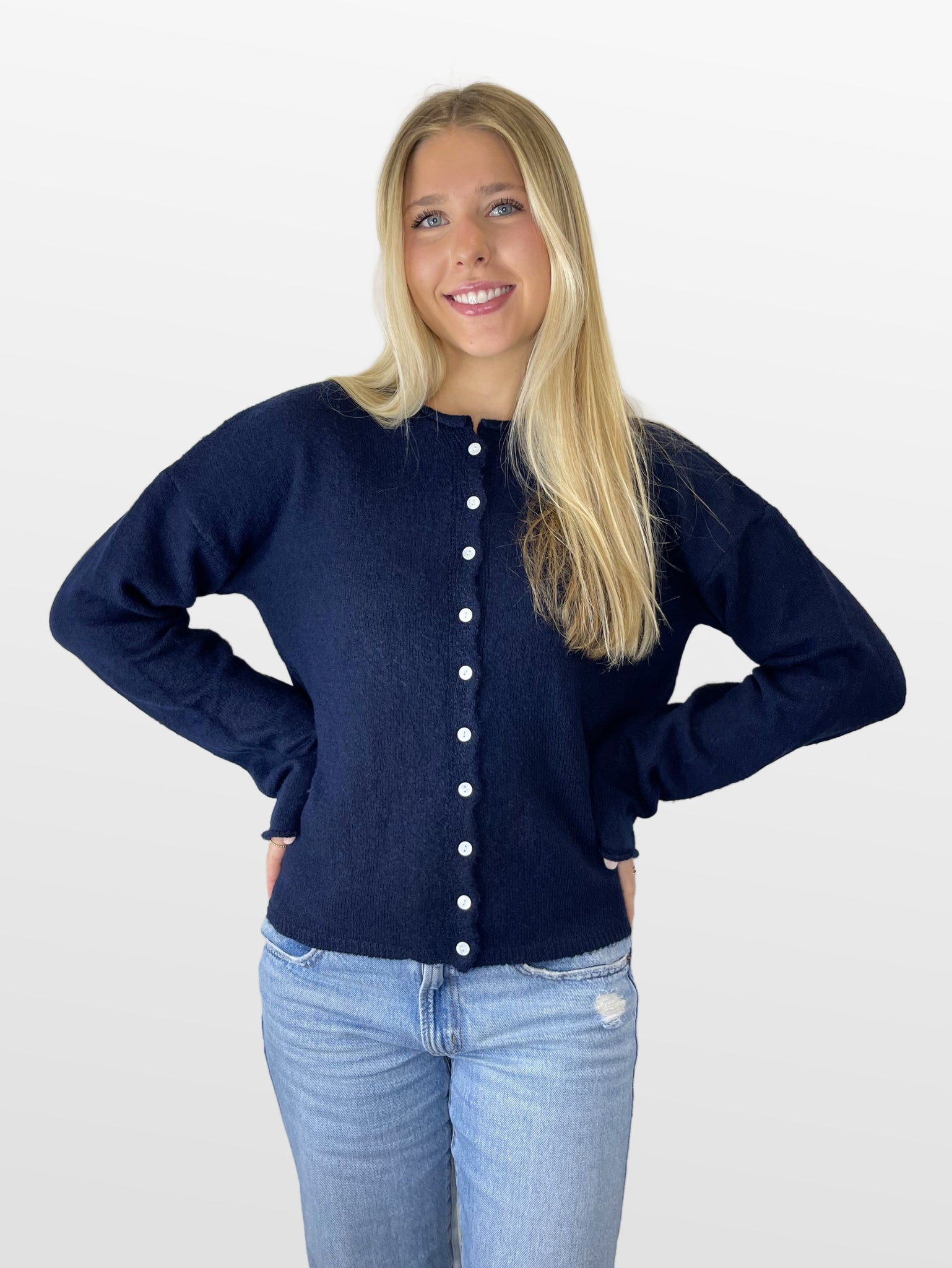 The softest, coziest layer your wardrobe needs. This staple cardigan features a rolled collar, button-down front, long sleeves with dropped shoulders, and a lightweight, relaxed fit. Wear it buttoned as a top or open over a tank—its classic-meets-contemporary style gives you endless outfit options year-round.  Color- Navy (Also Available in Pale Yellow)  61% Polyester 15% Acrylic 15% Nylon 6% Wool 3% Spandex