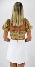 Try it on! A milder cotton version of the bustier, this crop is super cute. Elastic gathered sleeves have a small ruffle feature and look great on or off the shoulder. The charming ruffle continues to the subtle sweetheart neckline and down the front. This number fits the body with inset cup seams and a back zipper for a different take on that bustier look. Color- Gold (Also available in Blue) 100% Rayon
