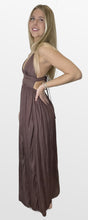 Sweet with a touch of sex appeal. This lightweight maxi dress has a delicate charm. The bodice has a deep v neckline with a wide elastic band at the midriff for fit. The spaghetti straps adjust and cross in back for a comfortable fit and the long skirt has slight gathers at the waistline and a thigh high slit for a sexy touch. Color-Brown 100% Polyester Lining- 95% polyester 5% Spandex