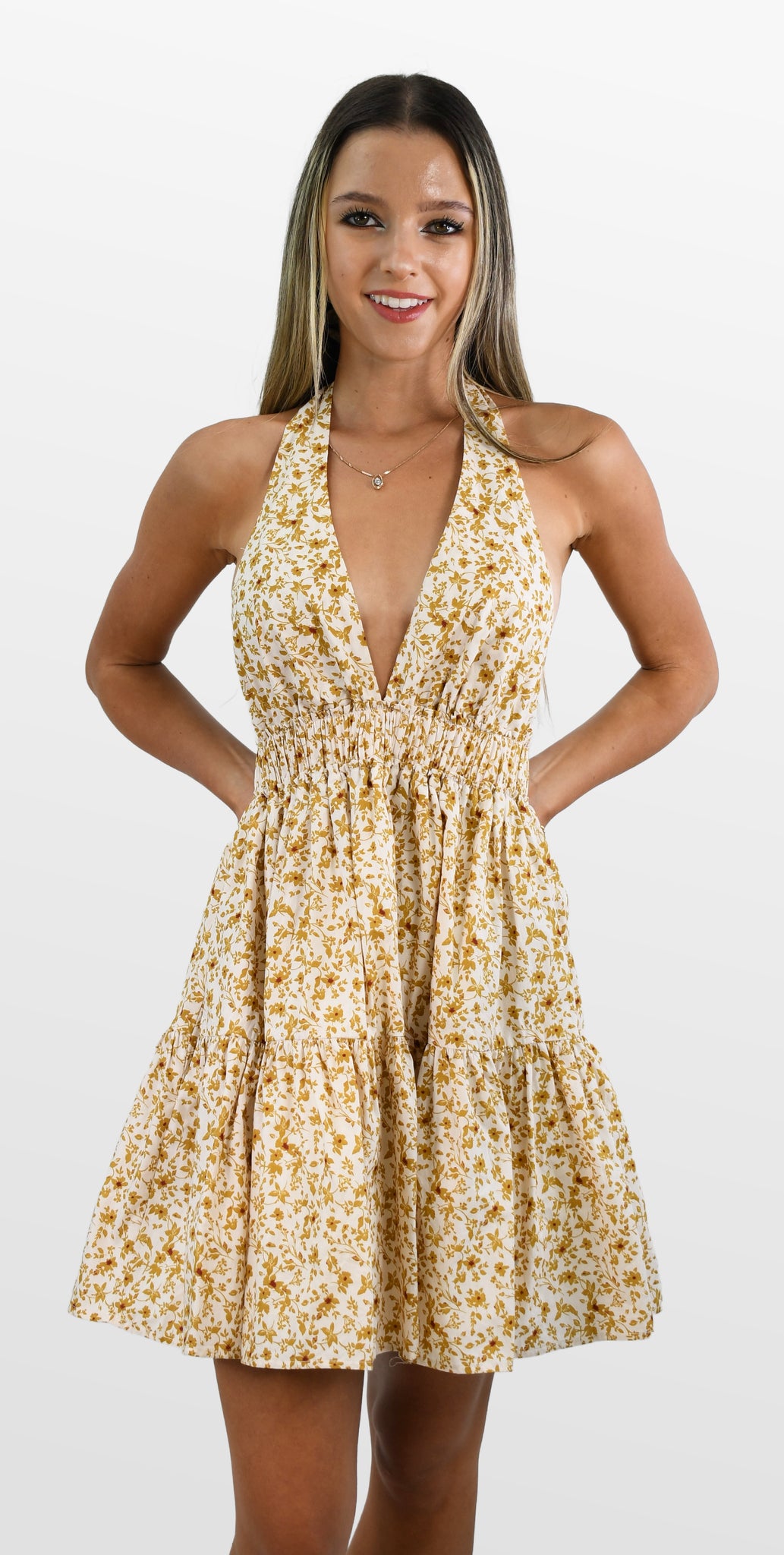 Chase the season in style. The halter top has a double fabric triangle bodice that forms a deep V and ties in a bow behind the neck. The empire waist sits below the bustline with an elastic waistband and a lined full skirt for all the movement you need. A ruffle bottom detail is all you need to complete the look. Add some boots to your outfit for a current style trend. Color- White with Rust-Brown Floral 100% Cotton Lining- 100% Cotton